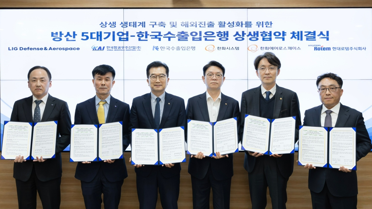 이미지 확대보기7일 수출입은행에 따르면 수출입은행은 LIG D&A·한국항공우주산업(KAI)·한화시스템·한화에어로스페이스·현대로템 등 주요 방산 5사와 ‘방산 상생 생태계 구축 및 해외진출 활성화를 위한 상생협약’을 체결했다.