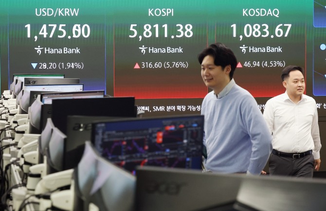 유가증권시장에서 코스피는 6% 가까이 상승해 5800선을 회복했다. 외국인 투자자가 5670억 원 순매수로 지수 상승을 주도하고 있다.