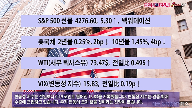 변동성 지수는 전일보다 0.19 포인트 떨어진 15.83을 기록했습니다. 변동성 지수는 연중 최저 수준에 근접하고 있습니다. 주가 변동이 크지 않을 것이라는 전망이 많습니다.