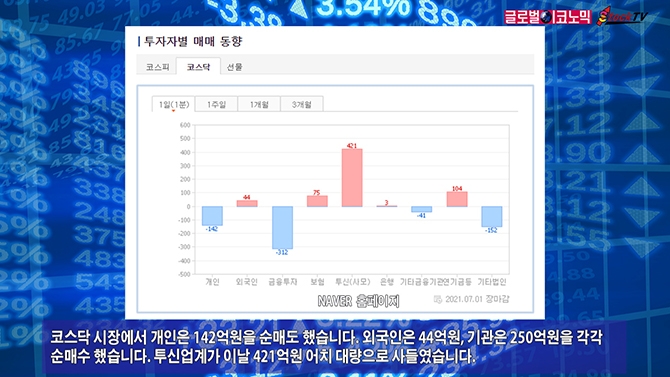 코스닥 시장에서 개인은 142억원을 순매도 했습니다. 외국인은 44억원, 기관은 250억원을 각각 순매수 했습니다. 투신업계가 이날 421억원 어치 대량으로 사들였습니다.