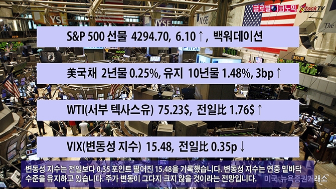 변동성 지수는 전일보다 0.35 포인트 떨어진 15.48을 기록했습니다. 변동성 지수는 연중 밑바닥 수준을 유지하고 있습니다. 주가 변동이 그다지 크지 않을 것이라는 전망입니다.