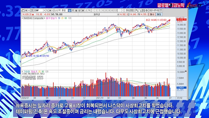 뉴욕증시는 일자리 증가로 고용시장이 회복되면서 나스닥이 사상최고치를 찍었습니다. 테이퍼링(긴축)은 속도 조절중이며 금리는 내렸습니다. 다우도 사상최고치에 근접했습니다.
