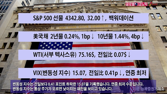 변동성 지수는 전일보다 0.41 포인트 하락한 15.07을 기록했습니다. 연중 최저 수준입니다. 변동성 지수는 통상 주가가 오르면 낮아지는 패턴을 보이고 있습니다.