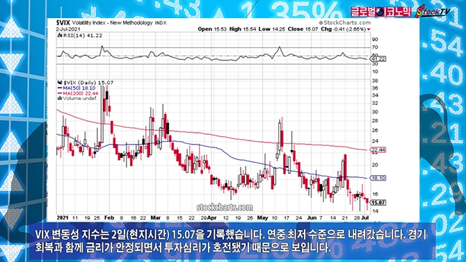 VIX 변동성 지수는 2일(현지시간) 15.07을 기록했습니다. 연중 최저 수준으로 내려갔습니다. 경기 회복과 함께 금리가 안정되면서 투자심리가 호전됐기 때문으로 보입니다.