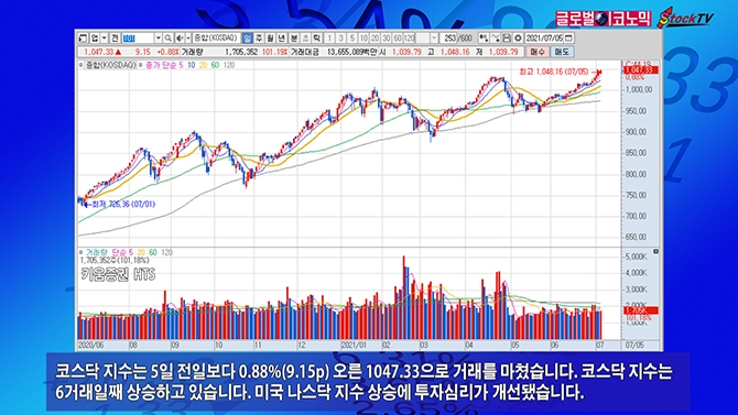 코스닥 지수는 5일 전일보다 0.88%(9.15p) 오른 1047.33으로 거래를 마쳤습니다. 코스닥 지수는 6거래일째 상승하고 있습니다. 미국 나스닥 지수 상승에 투자심리가 개선됐습니다.