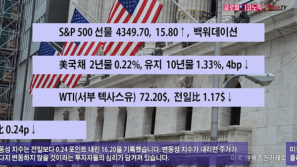 변동성 지수는 전일보다 0.24 포인트 내린 16.20을 기록했습니다. 변동성 지수가 내리면 주가가 그다지 변동하지 않을 것이라는 투자자들의 심리가 담겨져 있습니다.