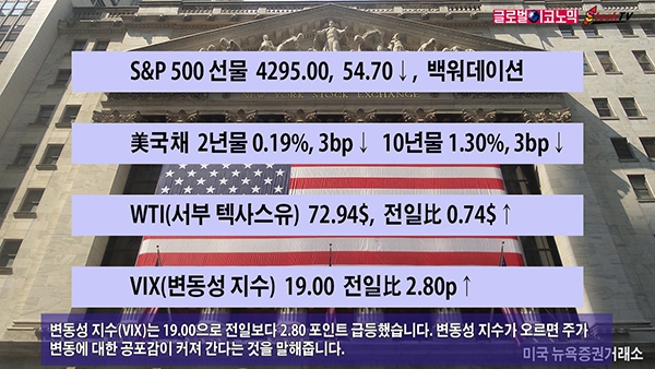 변동성 지수(VIX)는 19.00으로 전일보다 2.80 포인트 급등했습니다. 변동성 지수가 오르면 주가 변동에 대한 공포감이 커져 간다는 것을 말해줍니다.