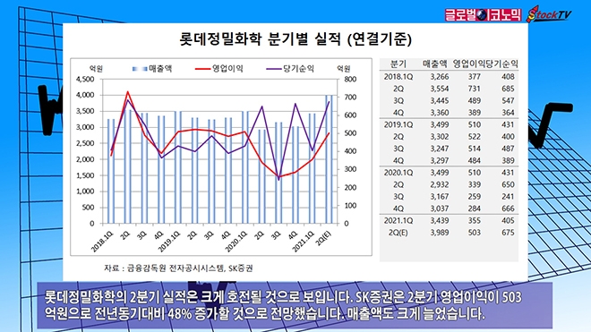 롯데정밀화학의 2분기 실적은 크게 호전될 것으로 보입니다. SK증권은 2분기 영업이익이 503억원으로 전년동기대비 48% 증가할 것으로 전망했습니다. 매출액도 크게 늘었습니다.