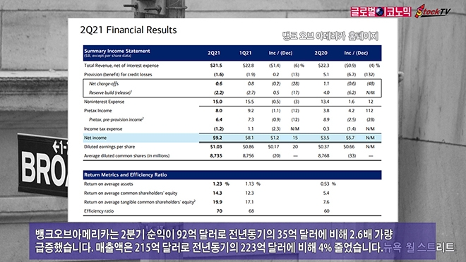 뱅크오브아메리카는 2분기 순익이 92억 달러로 전년동기의 35억 달러에 비해 2.6배 가량 급증했습니다. 매출액은 215억 달러로 전년동기의 223억 달러에 비해 4% 줄었습니다.