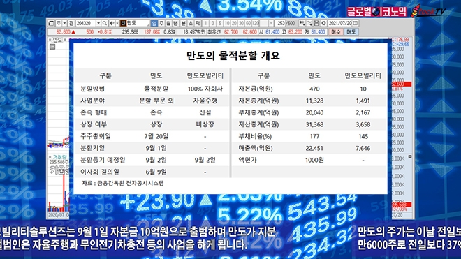 만도는 20일 열린 임시주주총회에서 물적분할안이 통과되자 불확실성이 걷히며 주가가 오름세로 돌아섰습니다. 장 초반에는 주가가 1% 넘게 하락했습니다.