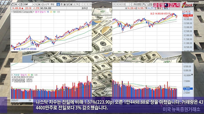 나스닥 지수는 전일에 비해 1.57%(223.90p) 오른 1만4498.88로 장을 마쳤습니다. 거래량은 43억4400만주로 전일보다 3% 감소했습니다.