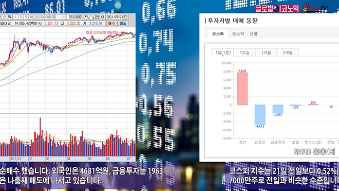 코스피 지수는 21일 전일보다 0.52%(16.79p) 내린 3215.91로 거래를 마쳤습니다. 거래량은 9억7000만주로 전일과 비슷한 수준입니다.