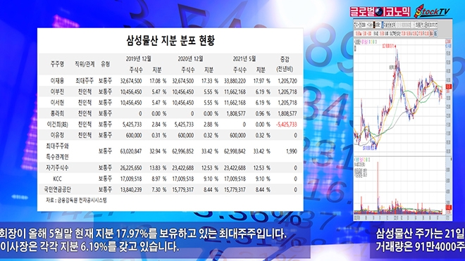 삼성물산은 이재용 부회장이 올해 5월말 현재 지분 17.97%를 보유하고 있는 최대주주입니다. 이부진 사장과 이서현 이사장은 각각 지분 6.19%를 갖고 있습니다.