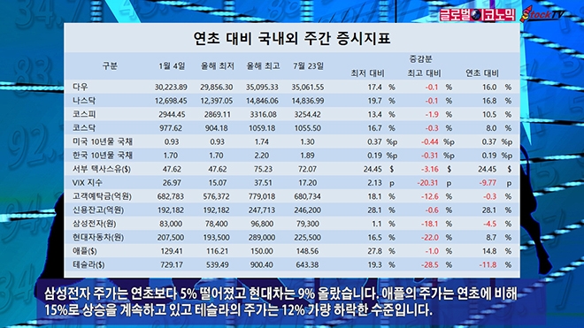다우와 나스닥은 2분기 기업 실적 호조로 지수가 연초보다 16% 상승했습니다. 다우와 나스닥은 연일 사상 최고치를 달리고 있습니다. 코스피는 11%, 코스닥은 8% 올랐습니다.