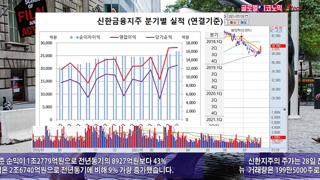신한지주는 2분기 연결기준 순익이 1조2779억원으로 전년동기의 8927억원보다 43% 급증했습니다. 순이자이익은 2조6740억원으로 전년동기에 비해 9% 가량 증가했습니다.