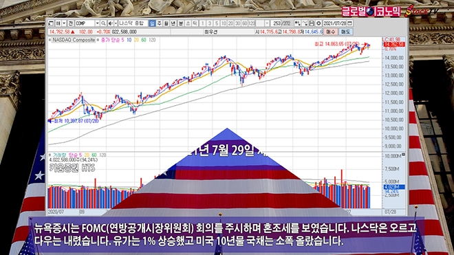뉴욕증시는 FOMC(연방공개시장위원회) 회의를 주시하며 혼조세를 보였습니다. 나스닥은 오르고 다우는 내렸습니다. 유가는 1% 상승했고 미국 10년물 국채는 소폭 올랐습니다.