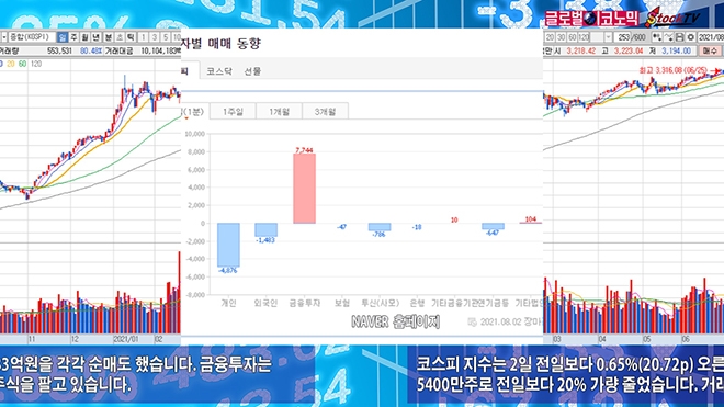 코스피 지수는 2일 전일보다 0.65%(20.72p) 오른 3223.04로 거래를 마쳤습니다. 거래량은 5억5400만주로 전일보다 20% 가량 줄었습니다. 거래량이 급격하게 줄고 있습니다.