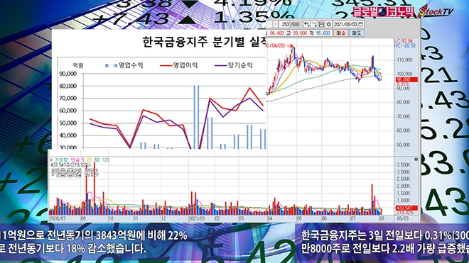 한국금융지주는 3일 전일보다 0.31%(300원) 오른 9만6200원에 장을 마감했습니다. 거래량은 43만8000주로 전일보다 2.2배 가량 급증했습니다.