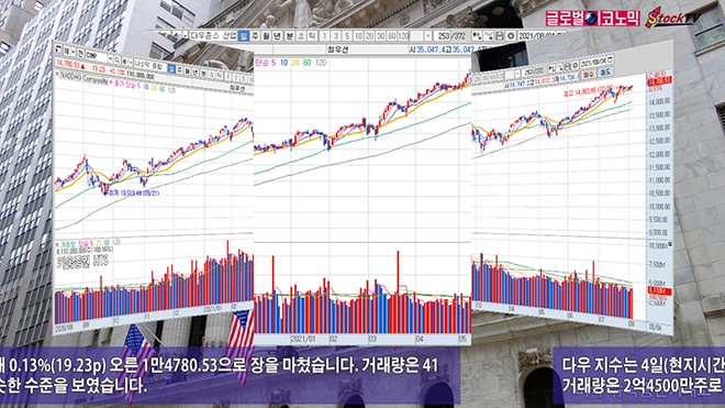 나스닥 지수는 전일에 비해 0.13%(19.23p) 오른 1만4780.53으로 장을 마쳤습니다. 거래량은 41억1000만주로 전일과 비슷한 수준을 보였습니다.