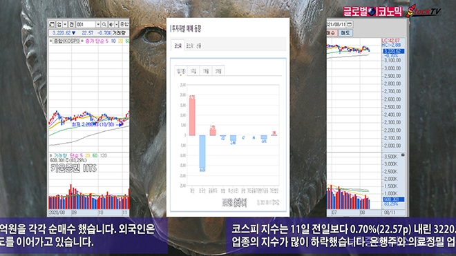 코스피 지수는 11일 전일보다 0.70%(22.57p) 내린 3220.62로 거래를 마쳤습니다. 전기전자 업종의 지수가 많이 하락했습니다. 은행주와 의료정밀 업종은 지수가 올랐습니다.