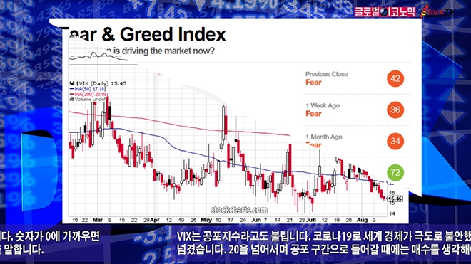 VIX는 공포지수라고도 불립니다. 코로나19로 세계 경제가 극도로 불안했을 때에는 80을 넘겼습니다. 20을 넘어서며 공포 구간으로 들어갈 때에는 매수를 생각해야 합니다.
