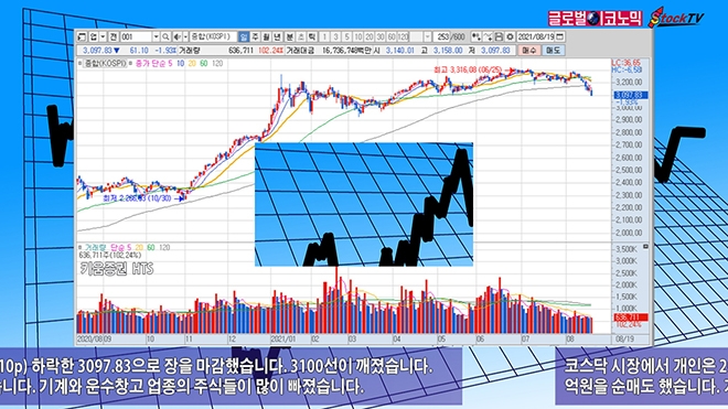 코스피 지수는 1.93%(61.10p) 하락한 3097.83으로 장을 마감했습니다. 3100선이 깨졌습니다. 중형주들의 하락폭이 컸습니다. 기계와 운수창고 업종의 주식들이 많이 빠졌습니다.