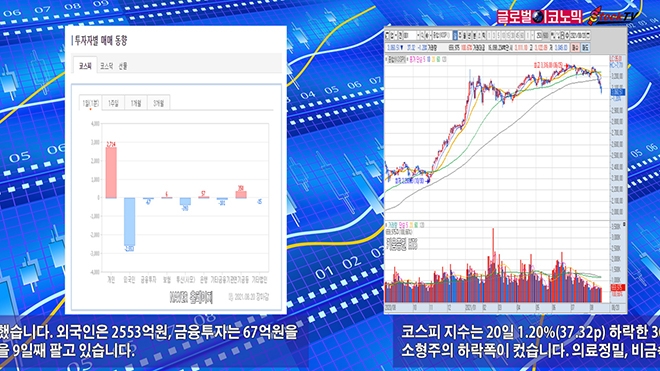 코스피 지수는 20일 1.20%(37.32p) 하락한 3060.51로 거래를 마쳤습니다. 전업종이 내렸고 소형주의 하락폭이 컸습니다. 의료정밀, 비금속광물, 건설업의 주식들이 많이 빠졌습니다.