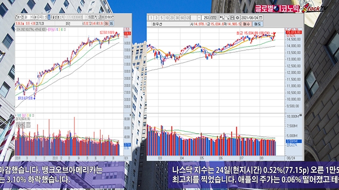 나스닥 지수는 24일(현지시간) 0.52%(77.15p) 오른 1만5019.80으로 장을 마쳤습니다. 사상 최고치를 찍었습니다. 애플의 주가는 0.06% 떨어졌고 테슬라는 0.31% 상승했습니다.