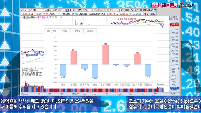 코스피 지수는 25일 0.27%(8.51p) 오른 3146.81로 거래를 마쳤습니다. 비금속광물, 철강금속, 섬유의복, 종이목재 업종이 많이 올랐습니다. 음식료와 의약품 업종은 하락했습니다.