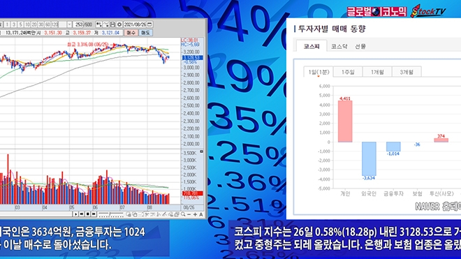 코스피 지수는 26일 0.58%(18.28p) 내린 3128.53으로 거래를 마쳤습니다. 대형주는 하락폭이 컸고 중형주는 되레 올랐습니다. 은행과 보험 업종은 올랐고 화학과 기계 업종은 내렸습니다.