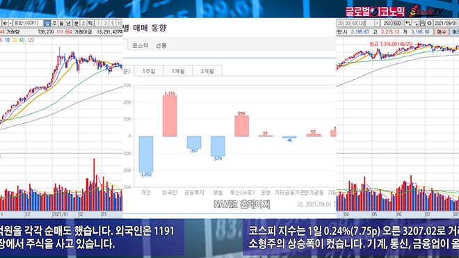 코스피 지수는 1일 0.24%(7.75p) 오른 3207.02로 거래를 마쳤습니다. 대형주는 내렸지만 소형주의 상승폭이 컸습니다. 기계, 통신, 금융업이 올랐습니다. 화학과 의약품은 내렸습니다.