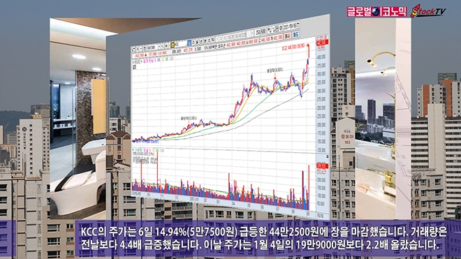 KCC의 주가는 6일 14.94%(5만7500원) 급등한 44만2500원에 장을 마감했습니다. 거래량은 전날보다 4.4배 급증했습니다. 이날 주가는 1월 4일의 19만9000원보다 2.2배 올랐습니다.
