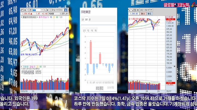 코스닥 지수는 7일 0.14%(1.47p) 오른 1054.43으로 거래를 마쳤습니다. 열흘간 올랐고 하락한지 하루 만에 반등했습니다. 화학, 금속 업종은 올랐습니다. 기계장비와 섬유는 내렸습니다.
