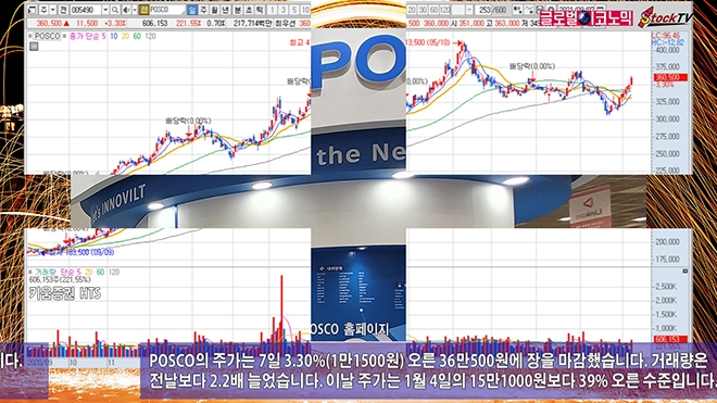 POSCO의 주가는 7일 3.30%(1만1500원) 오른 36만500원에 장을 마감했습니다. 거래량은 전날보다 2.2배 늘었습니다. 이날 주가는 1월 4일의 15만1000원보다 39% 오른 수준입니다.