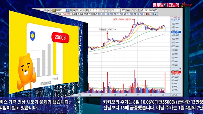 카카오의 주가는 8일 10.06%(1만5500원) 급락한 13만8500원에 장을 마감했습니다. 거래량은 전날보다 15배 급증했습니다. 이날 주가는 1월 4일의 7만9500원보다 74% 오른 수준입니다.