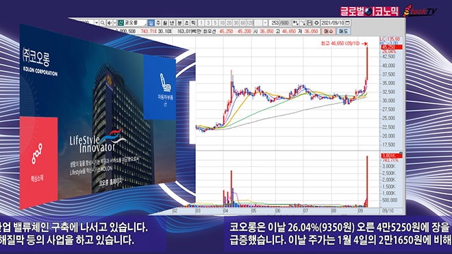 코오롱은 이날 26.04%(9350원) 오른 4만5250원에 장을 마감했습니다. 거래량은 전날보다 7.4배 급증했습니다. 이날 주가는 1월 4일의 2만1650원에 비해 2.1배 상승한 수준입니다.