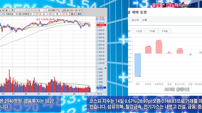 코스피 지수는 14일 0.67%(20.97p) 오른 3148.83으로 거래를 마쳤습니다. 중형주의 상승폭이 컸습니다. 섬유의복, 철강금속, 전기가스는 내렸고 건설, 금융, 증권, 보험은 올랐습니다.