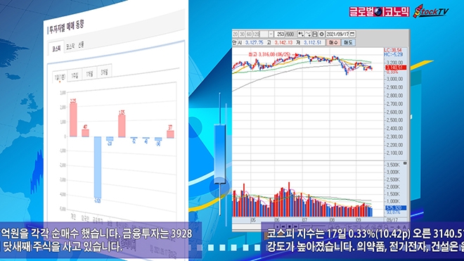 코스피 지수는 17일 0.33%(10.42p) 오른 3140.51로 거래를 마쳤습니다. 장 후반으로 갈수록 상승 강도가 높아졌습니다. 의약품, 전기전자, 건설은 올랐고 음식료, 섬유의복은 내렸습니다.