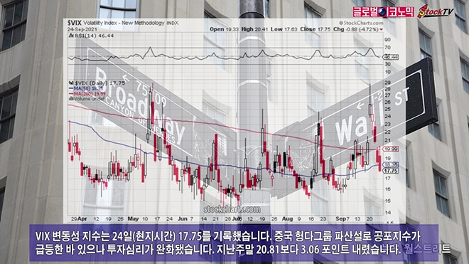 VIX 변동성 지수는 24일(현지시간) 17.75를 기록했습니다. 중국 헝다그룹 파산설로 공포지수가 급등한 바 있으나 투자심리가 완화됐습니다. 지난주말 20.81보다 3.06 포인트 내렸습니다.