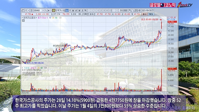 한국가스공사의 주가는 28일 14.10%(5900원) 급등한 4만7750원에 장을 마감했습니다. 장중 52주 최고가를 찍었습니다. 이날 주가는 1월 4일의 3만800원보다 55% 상승한 수준입니다.