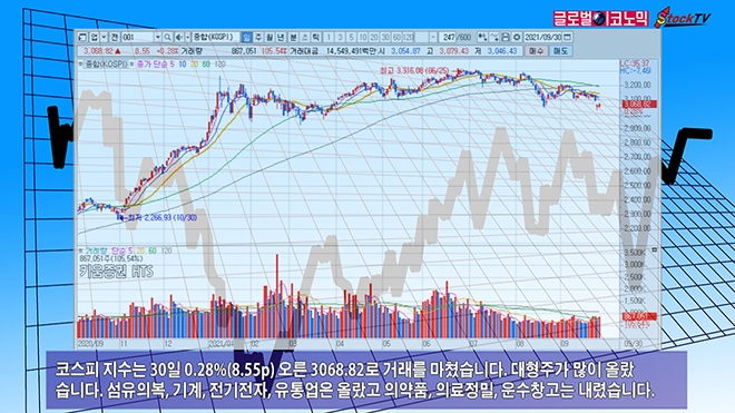 코스피 지수는 30일 0.28%(8.55p) 오른 3068.82로 거래를 마쳤습니다. 대형주가 많이 올랐습니다. 섬유의복, 기계, 전기전자, 유통업은 올랐고 의약품, 의료정밀, 운수창고는 내렸습니다.