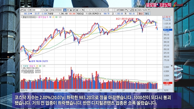 코스닥 지수는 2.00%(20.07p) 하락한 983.20으로 장을 마감했습니다. 1000선이 또다시 붕괴됐습니다. 거의 전 업종이 하락했습니다. 반면 디지털콘텐츠 업종은 소폭 올랐습니다.