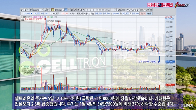 셀트리온의 주가는 5일 12.10%(3만원) 급락한 21만8000원에 장을 마감했습니다. 거래량은 전날보다 2.3배 급증했습니다. 주가는 1월 4일의 34만7500원에 비해 37% 하락한 수준입니다.