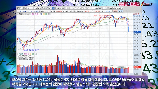 코스닥 지수는 3.46%(33.01p) 급락한 922.36으로 장을 마감했습니다. 코스닥은 올해들어 최대의 낙폭을 보였습니다. 대부분의 업종이 하락했고 방송서비스 업종만 소폭 올랐습니다.
