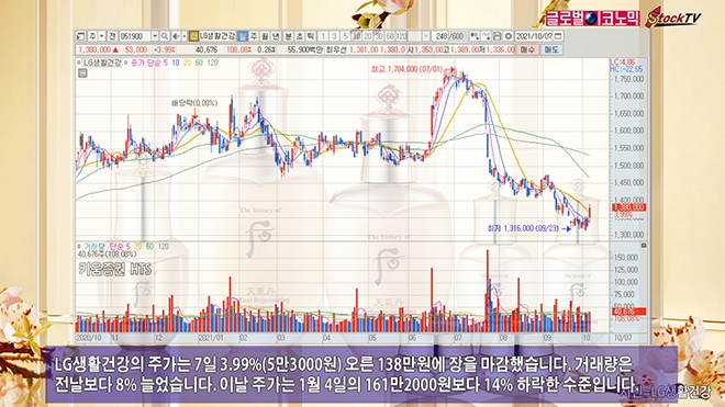 LG생활건강의 주가는 7일 3.99%(5만3000원) 오른 138만원에 장을 마감했습니다. 거래량은 전날보다 8% 늘었습니다. 이날 주가는 1월 4일의 161만2000원보다 14% 하락한 수준입니다.