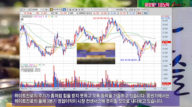 하이트진로의 주가는 7일 2.36%(800원) 오른 3만4700원에 장을 마감했습니다. 거래량은 전날과 비슷한 규모입니다. 이날 주가는 1월 4일의 3만2000원보다 8% 오른 수준입니다.