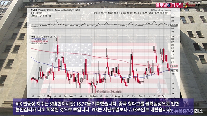 VIX 변동성 지수는 8일(현지시간) 18.77을 기록했습니다. 중국 헝다그룹 불확실성으로 인한 불안심리가 다소 희석된 것으로 보입니다. VIX는 지난주말보다 2.38포인트 내렸습니다.