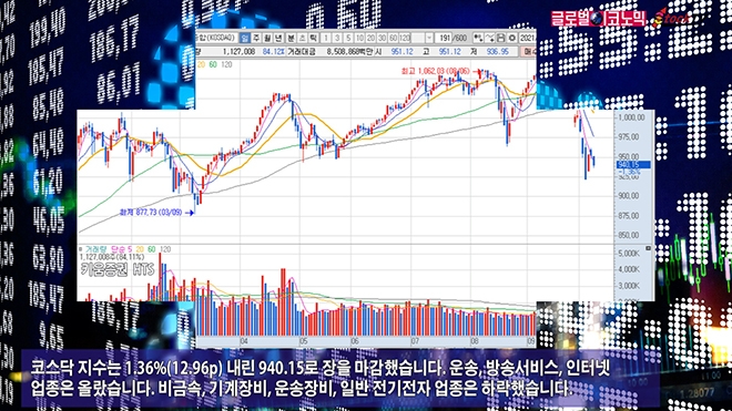 코스닥 지수는 1.36%(12.96p) 내린 940.15로 장을 마감했습니다. 운송, 방송서비스, 인터넷 업종은 올랐습니다. 비금속, 기계장비, 운송장비, 일반 전기전자 업종은 하락했습니다.