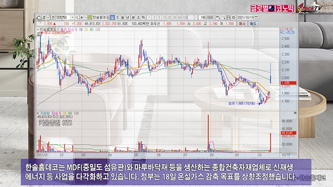 한솔홈데코는 MDF(중밀도 섬유판)와 마루바닥재 등을 생산하는 종합건축자재업체로 신재생에너지 등 사업을 다각화하고 있습니다. 정부는 18일 온실가스 감축 목표를 상향조정했습니다.