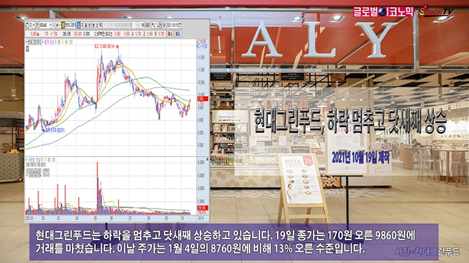 현대그린푸드는 하락을 멈추고 닷새째 상승하고 있습니다. 19일 종가는 170원 오른 9860원에 거래를 마쳤습니다. 이날 주가는 1월 4일의 8760원에 비해 13% 오른 수준입니다.
